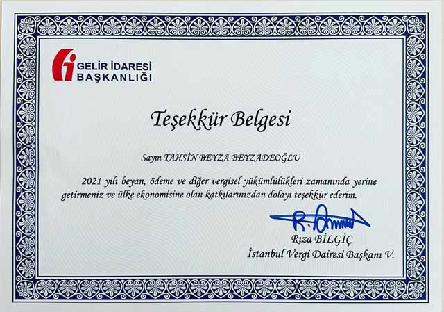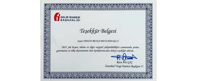 Certificate of Appreciation from Istanbul Tax Office to Beyzadeoğlu Clinic